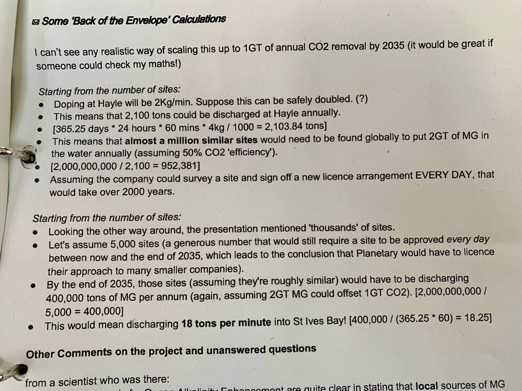 Planetary Technologies made some startling claims about how quickly they wanted to grow during our early community meetings. They stated that they were aiming for 1 Gigatonne (one billion tonnes – 1,000,000,000)annual C02 removal by 2035. PT called this ambition ‘insane’ but stuck to it. What were the ramifications for St. Ives Bay? Did this mean an ‘insanely’ quick scaling up operation with an ‘insane’ amount of Magnesium Hydroxide eventually being discharged into our local sea?